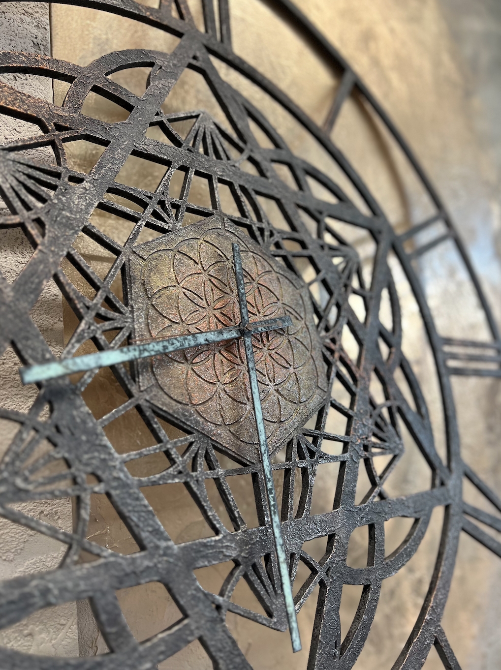 В работе постарались сочетать восточный и западный орнамент, добавили немного противостояний по цвету, эпохам и стилям, соединив их в пульсирующей мандале майянского календаря. Главный подход к работе - это разрыв указанных в битве шаблонов: восточный колорит цветов и переливов, смелые яркие акценты стали подложкой для классических и западных орнаментов, а западный приглушённый натуральный эко стиль вписался, как величественный и белоснежный Тадж-Махал в изящные оттиски восточного орнамента, где лишь намёком просачивается золотистая патина.